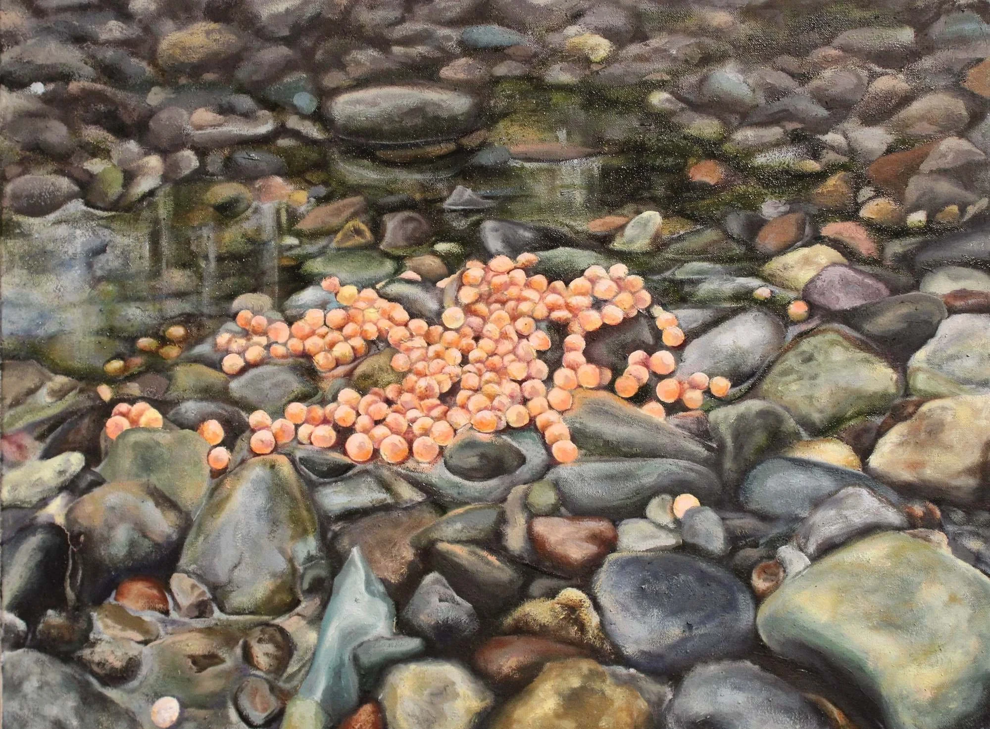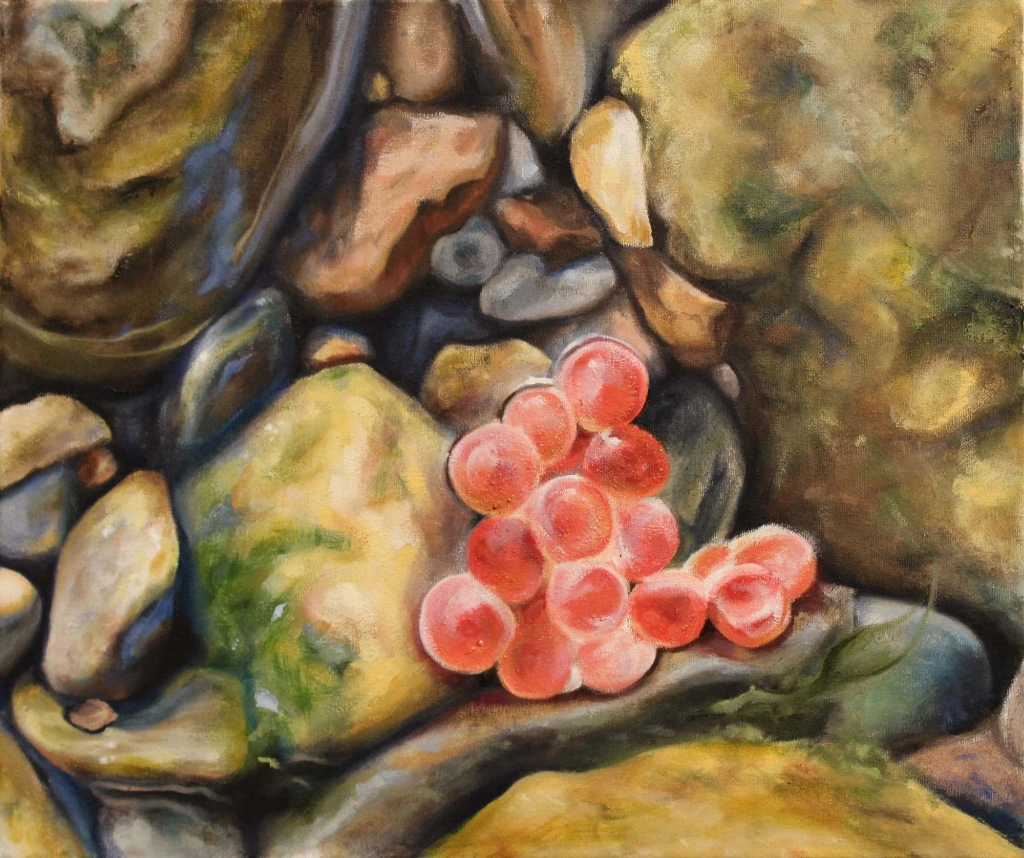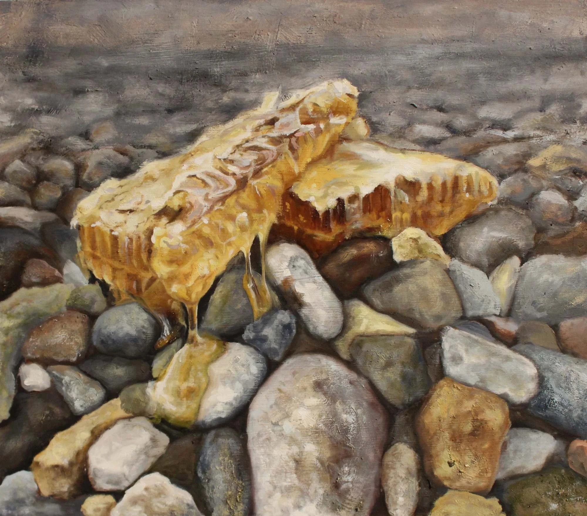 The fecundity of honeycomb, berries, and salmon roe evoke a pervasive sensuality. They embody the expansive quality of divine femininity—salmon roe and berries as reproductive seeds and honeycomb as a matriarchal mecca of activity. Placed or found in the rocks of riverbeds and ocean shores, these subjects are grounded by the physical earth. As these eggs, hives, and seeds evolve, their swift life cycles clash with the expanse of geological time and history. The repetition of seeds, eggs, and patterns emphasize the multiplication, ordered organization, and replication of matter. I use specific colors and expressive brush strokes to create a heightened sensory environment.